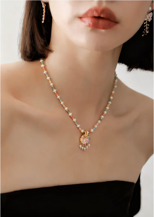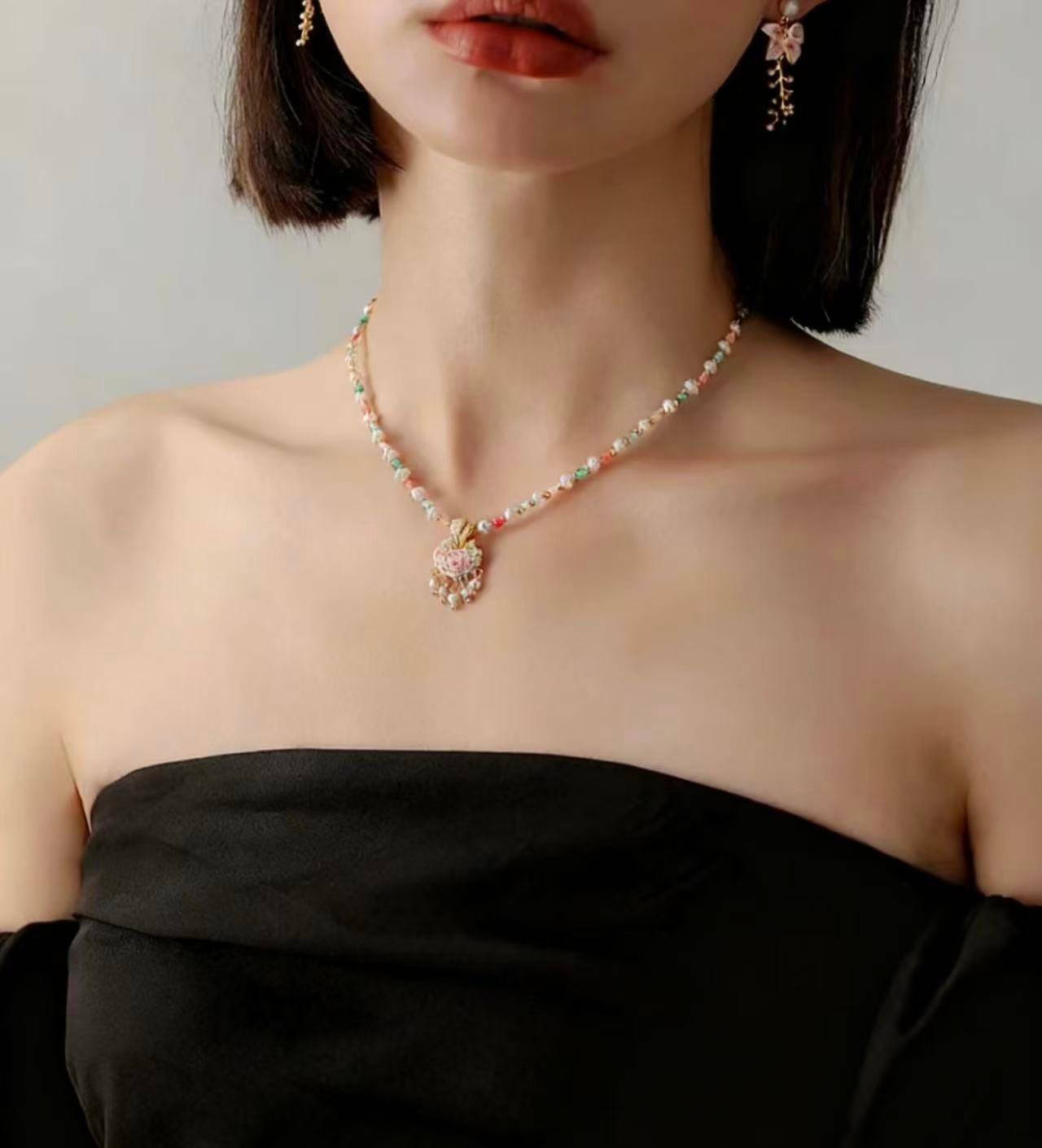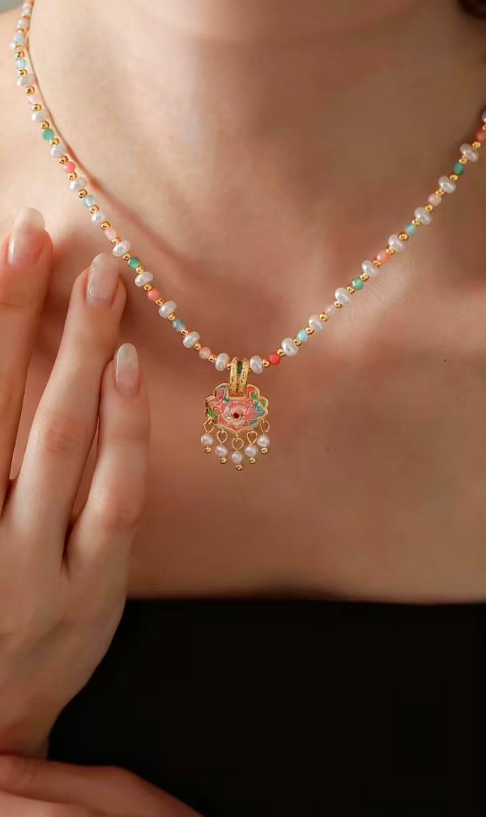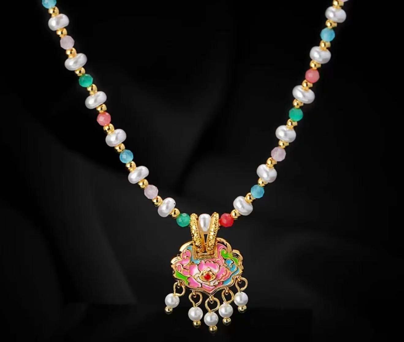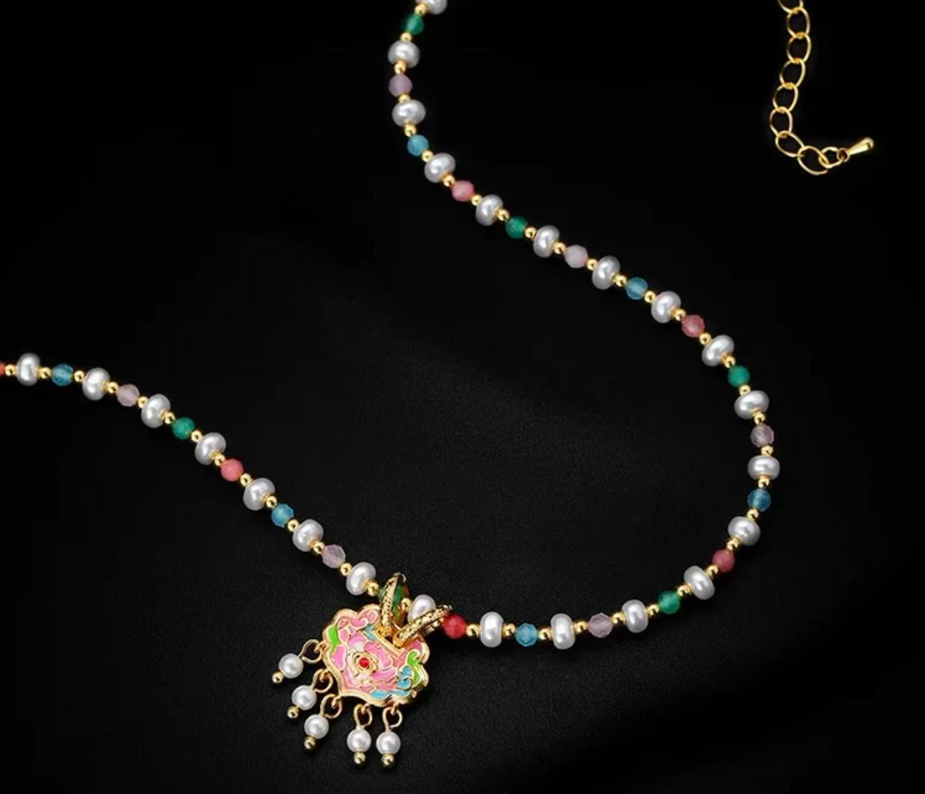 Chinese style safety lock pearl long necklace, niche colored bead design, long-lasting lock tassel pendant, collarbone chain