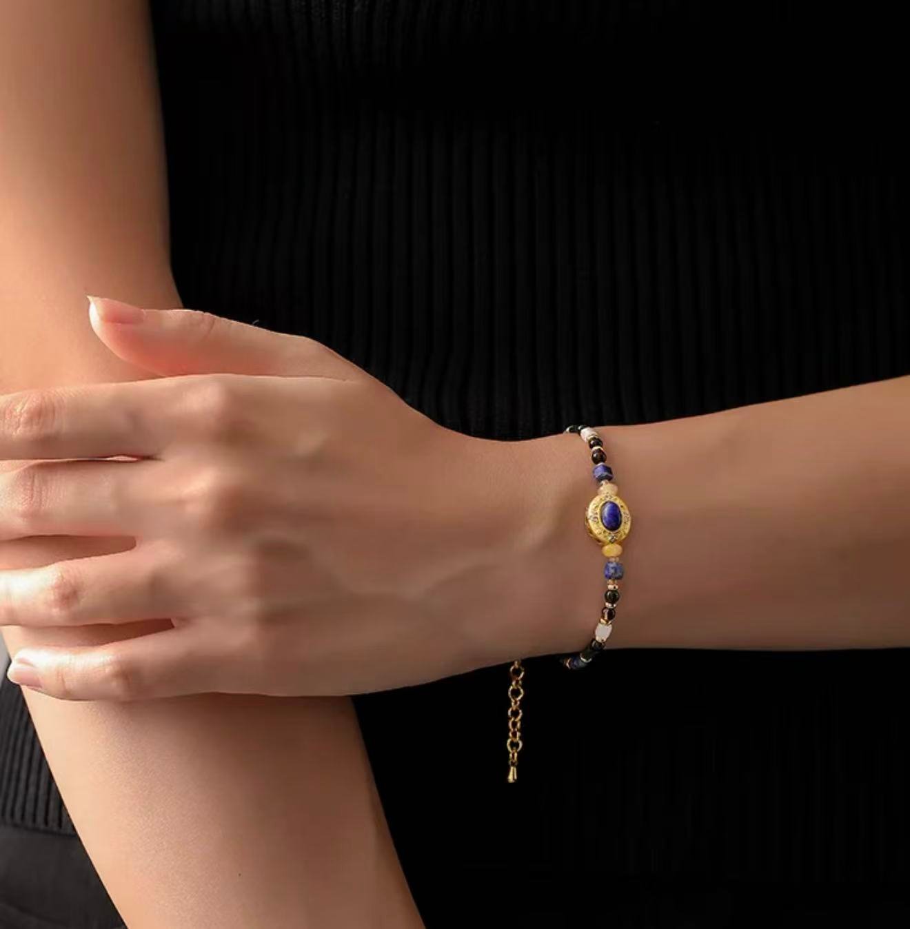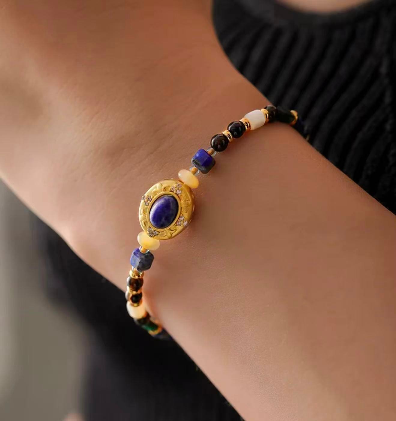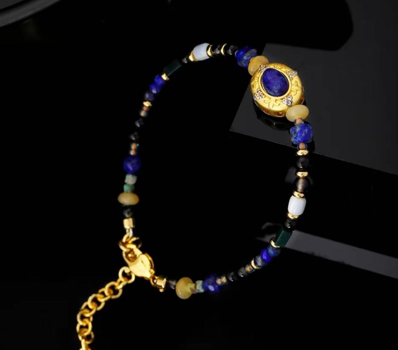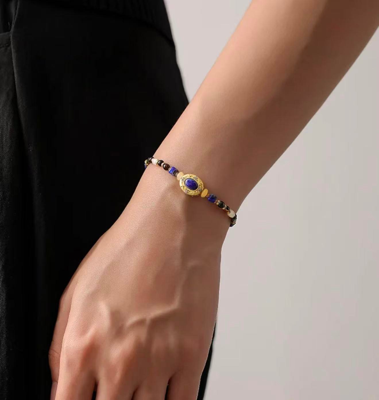 • Natural Lapis Lazuli: Features deep blue natural lapis lazuli stones, each with its unique golden pyrite specks (star-like inclusions).