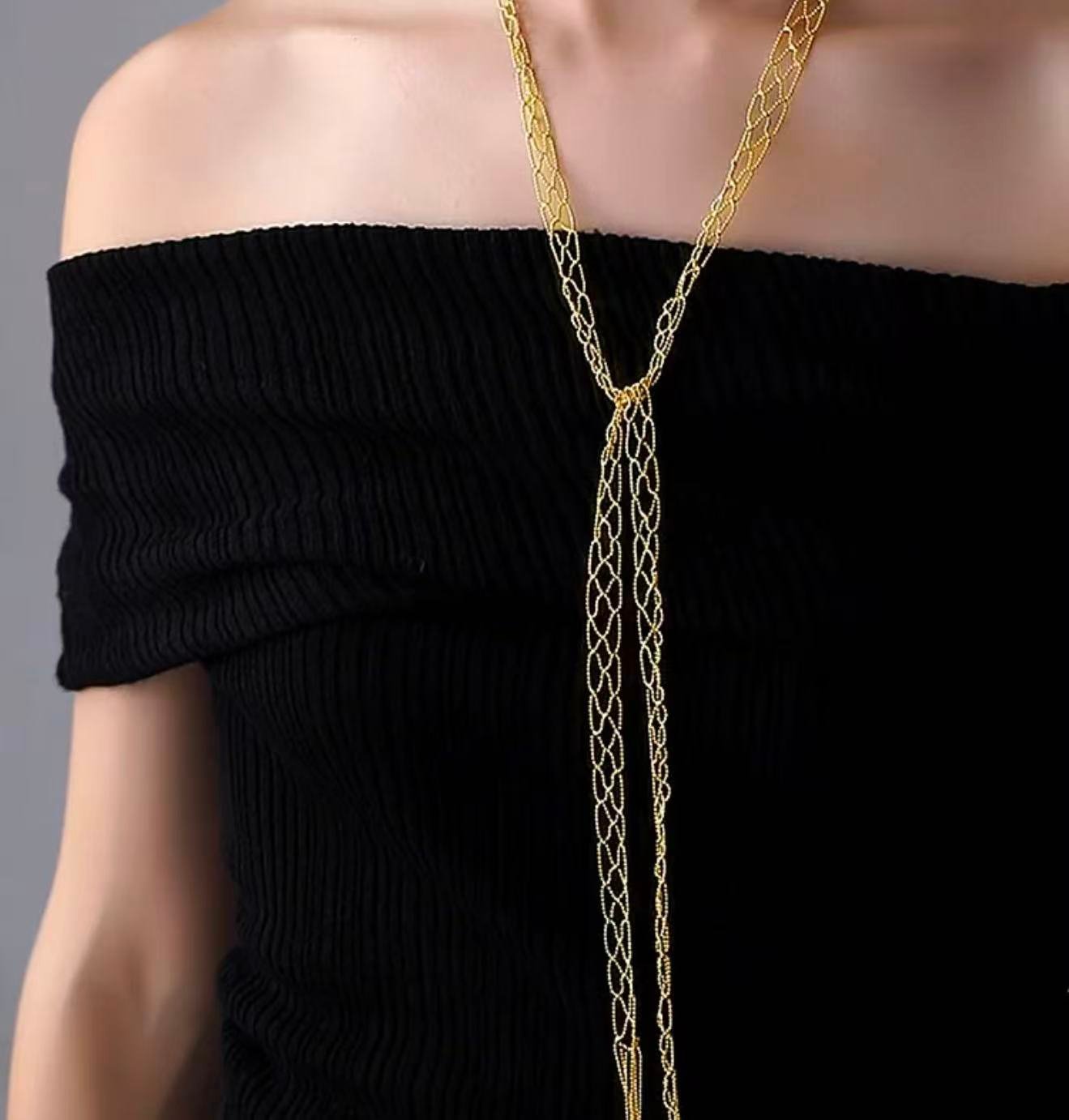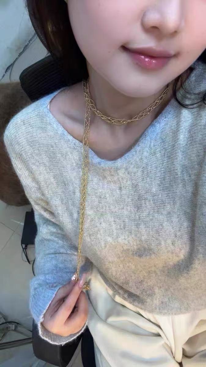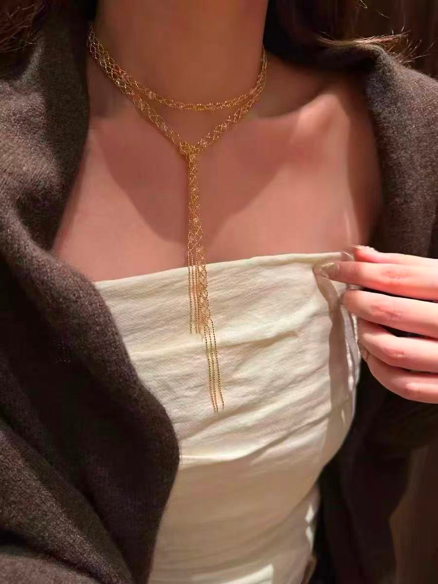 Meet the necklace designed specifically to complement your favorite, coziest long sweater. Stripped of all unnecessary detail, it defines your silhouette with pure, fluid lines and a subtle glow, creating a focal point of understated elegance.